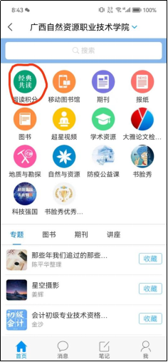 下载超星学习通app,在首页输入邀请码“gxzrzyzy”进入广西自然资源职业技术学院界面,点击“阅读积分”(如下图所示)参与活动。
