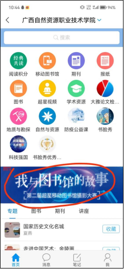 下载超星学习通app,在首页输入邀请码“gxzrzyzy”进入广西自然资源职业技术学院界面,点击“我与图书馆的故事”模块(如下图所示)参与活动。