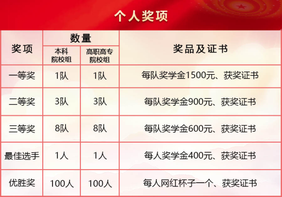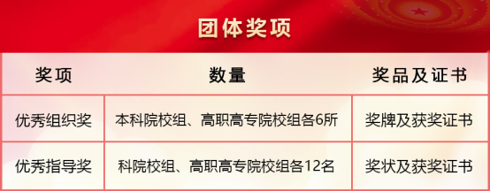1.优秀组织奖:为激励各高校积极组织学生参与主题教育活动,主办方将根据各高校的参赛人数、成绩与活动组织情况,对本科院校、高职高专院校分别进行排名,评选优秀组织奖12所(本科院校组、高职高专院校组各6所)。