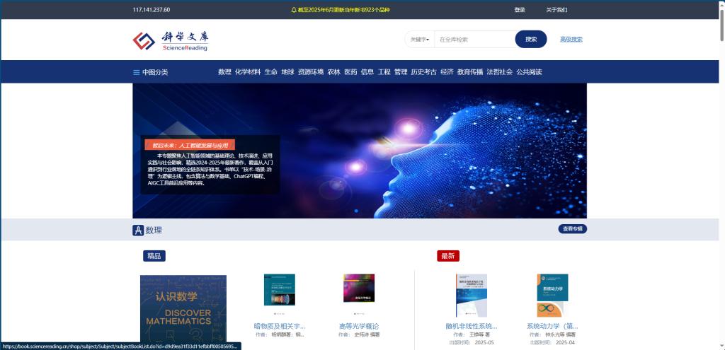 科学文库是以高质量学术专著和教材为主要内容、以全学科知识服务为特色的数据库平台,收录众多获奖作品、各学科领域经典图书、知名专家著作、系列重点丛书等高质量专业知识内容,是优秀科学家的群体智慧宝库,曾获中国出版界最高奖——“中国出版政府奖”。科学文库以服务于教育科研机构的专业人员为宗旨,提供专业优质的数字图书资源、高效便捷的知识服务,满足各个层次的专业人士和广大用户对权威、经典、实用科技知识的需求,有效支撑科学知识水平提高、相关学科建设和人才培养。所有内容均未授权第三方,保证资源独有性。