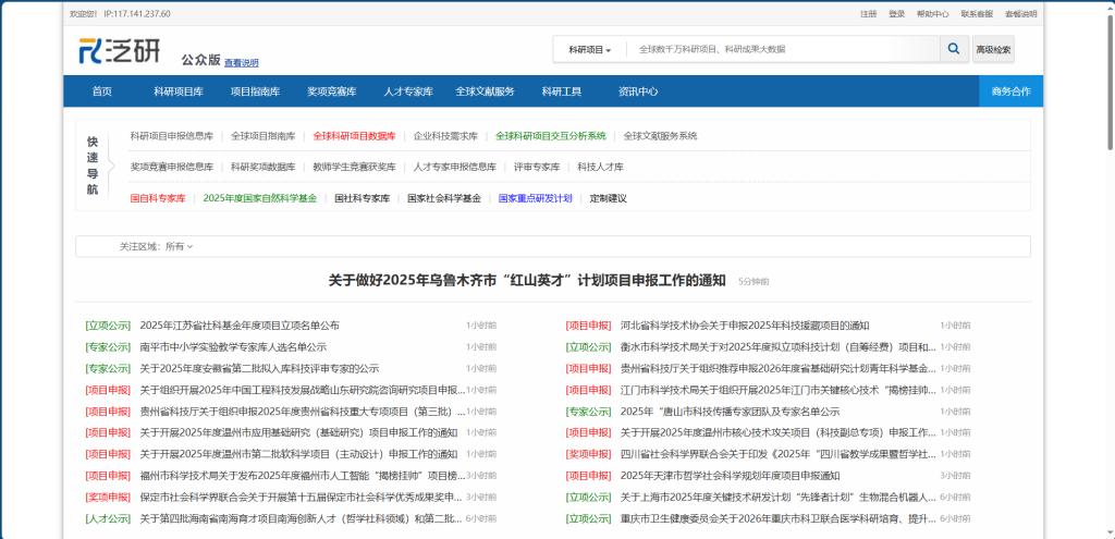 泛研网全球科研项目数据库为科学工作者、学习者提供基于科研项目为入口视角的大数据情报服务,解决长久以来科研情报生态缺失的重要起始环节。适用于课题申报前查重查新,获取国内外最新的立项及项目成果前沿情报,了解国内各地区最新的项目资助情报、奖项申报评选、竞赛通知、人才选拔评选通知、往年公示的基金专家、科技专家库专家以及其他科技人才、公开的科技奖等获奖名单及获奖成果等信息,发现与市场、行业对接,科研成果转化机会,及时全面获取国内外文献专著,国家自然科学基金、国家社会科学基金、国家重点研发计划定制化检索,提供快捷检索入口,支持个性化定制对标分析,收集引领全球科技发达国家科研资助趋势、方向性的项目指南,自定义检索字段导出数据用于前沿分析,国自然申报代码推荐,辅助立项申报决策等。资源类型涉及科研项目、人才专家及奖项竞赛相关事实数据、项目成果链接指向、科技报告、文献专著、交互分析系统、项目指南、科研辅助工具等。