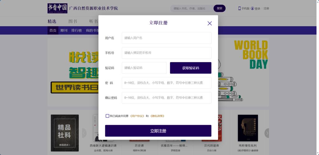 1.注册账号登录:在校园网Ip范围内注册账号后,可在任何地点使用电脑端、app端登录: 注册方式:打开书香中国网址 → 点击首页右上角“注册”按钮,填写相关信息进行注册,并绑定手机号。(如图)