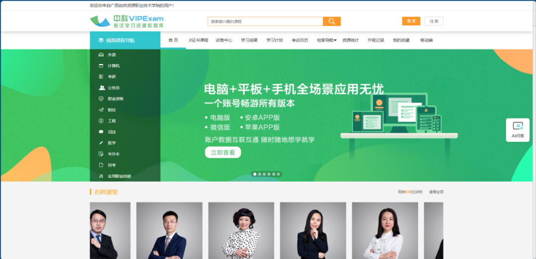作为目前国内视频课程量最大的职业教育数据库,VIPExam考试库依托权威专业的师资力量,现已建成全方位、立体化、多层次的课程体系,收录外语、计算机、考研、公务员、职业资格、财经、工程、司法、医学、专升本、自考、实用职业技能共12大专辑2200余个考试科目的视频课程、历年真题试卷与模拟试卷,并提供了课程学练、模拟自测、错题记录、错题组卷、专项练习、学习进展等高效自主学习工具。