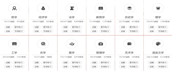 是以高校课程试题为主要内容的试题资源,包含了教育部12个学科大类、100个二级学科、400余个三级学科类目下的3.2万套课程试卷,收录试题量已达到190万道,可以为老师组织考试提供资源帮助,也可以提供学生线上查看试题内容和答案、收藏试题进行有针对性地练习复习使用。